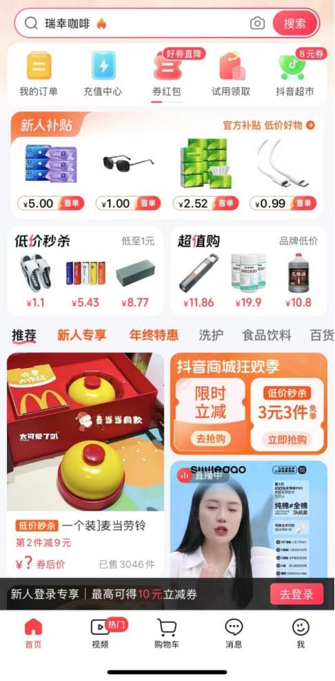 抖音商城将“低价秒杀”放在banner推荐位下方,给予更重要的展示位置;APP界面与当下主流货架电商平台相似,用户可以通过抖音一键登录,不用看直播和视频就能下单购物。抖音亮出了加码货架的意图。