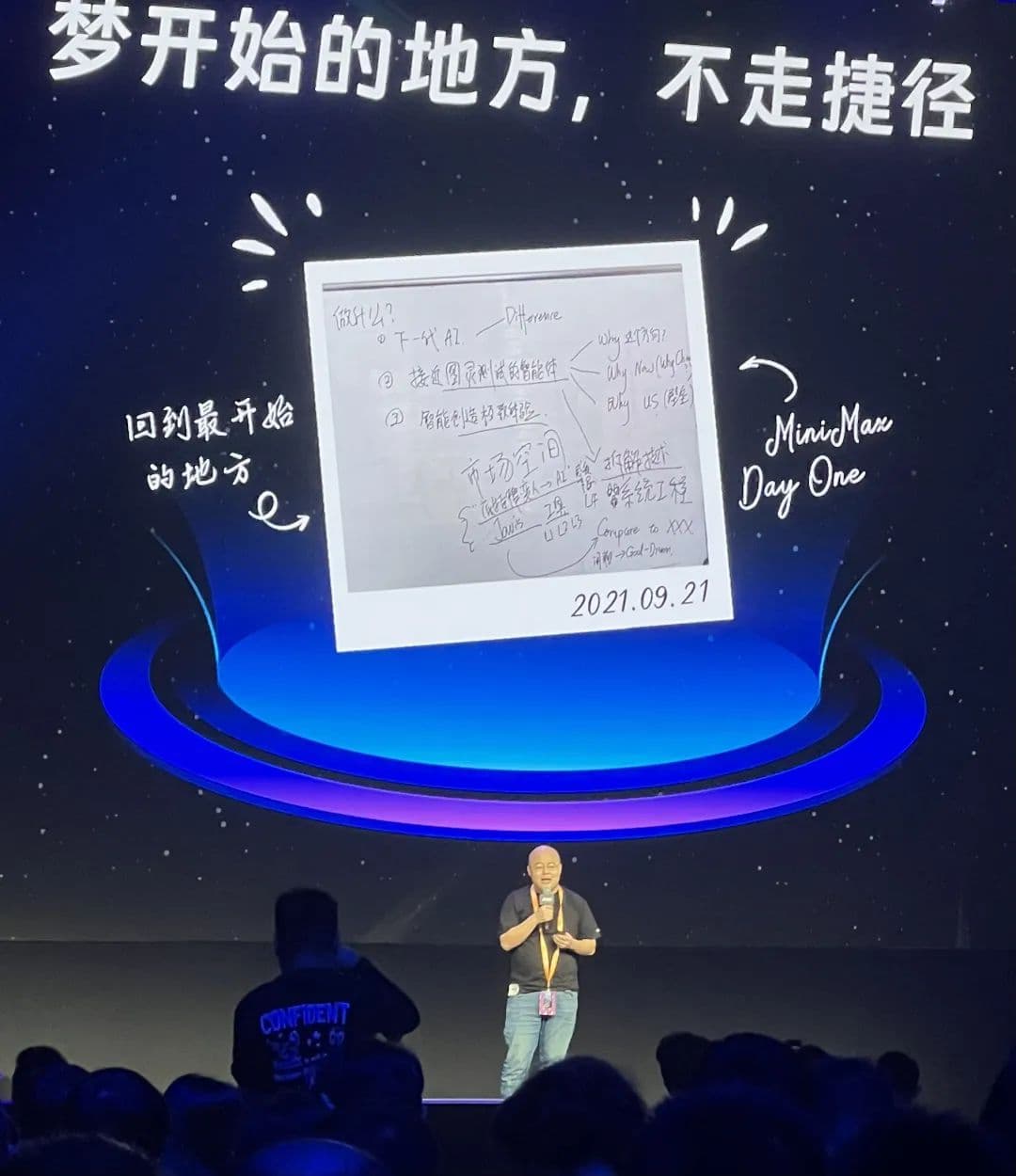闫俊杰在钉钉生态大会上分享MiniMax的Day1,图片来自「甲子光年」拍摄