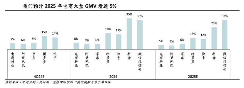 上图乃是交银国际对代表电商平台GMV的预测情况,尽管快手相对于行业大盘增速优势有放大之势(从2024年其增速是大盘的2.125倍,2025年预期为2.4倍),但受限于上述种种因素,其电商增速的绝对值压力是显而易见。