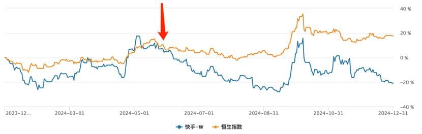 若用资本市场表现进行验证上述观点则更为清晰,2024年开局之后虽偶有波折快手和恒生指数大盘仍然保持了高度的相关性,属基本于同频共振,知道5月下旬之后,两条折线越发分离,直到如今。