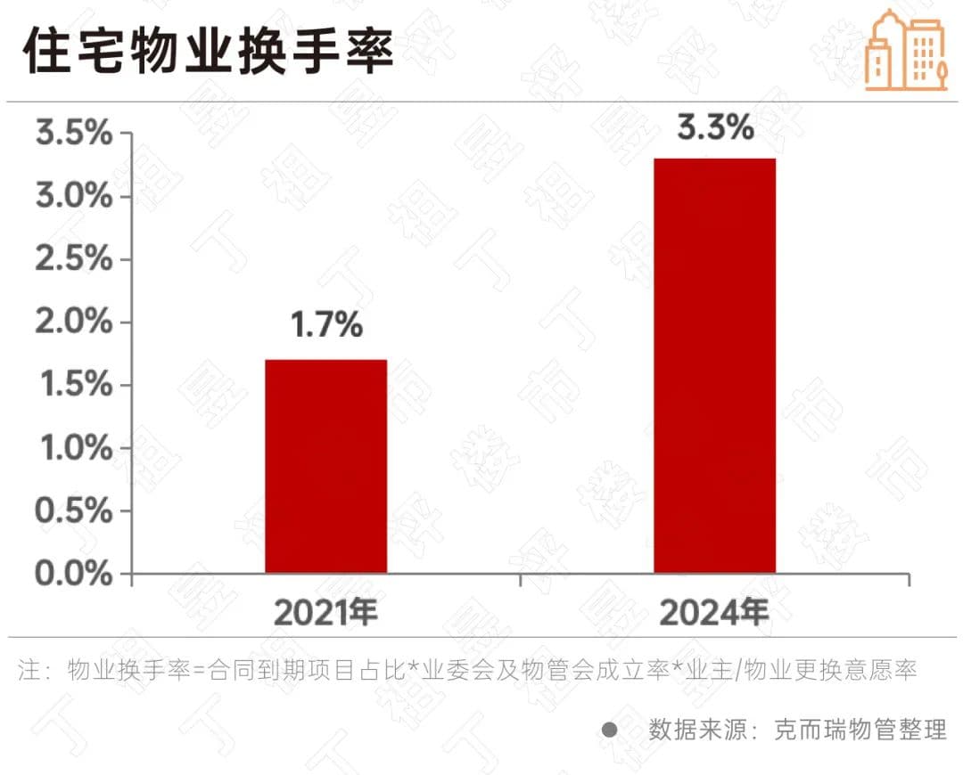 据克而瑞物管调研统计显示,2021-2024年,住宅物业换手率由1.7%持续提升至3.3%,净增长1.6个百分点,意味着每年约有2万个住宅小区更换物业公司。