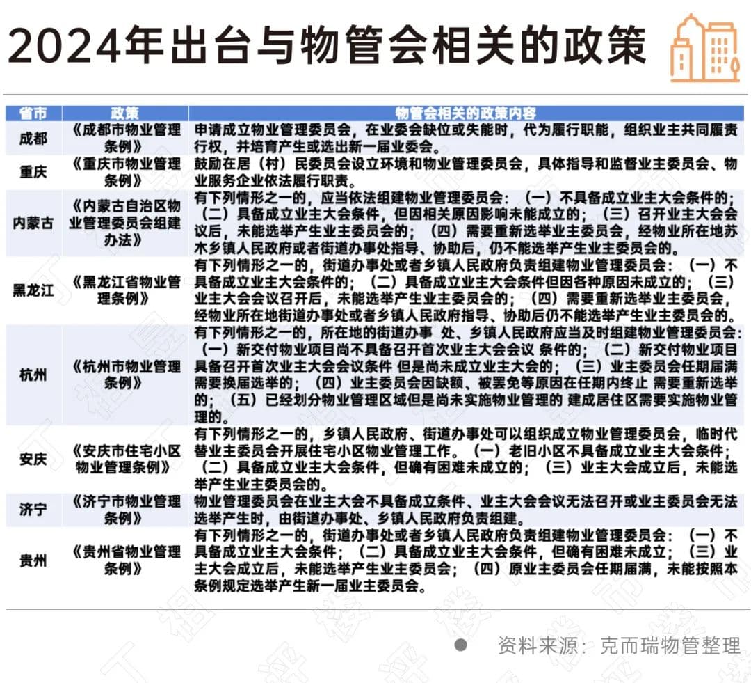 其一,很多城市业委会或物管会成立率提升。早在2020年5月,《北京市物业管理条例》首次明确提出,街道办事处、乡镇人民政府可以组建物管会。截至2024年7月,北京已组建物管会5100余个,业委会或物管会组建率高达97%。针对业委会组建率较低的现状,2024年不少城市重新修订《物业管理条例》,通过组建物管会来补位业委会,如《济宁市物业管理条例》创新性设立了物管会制度。