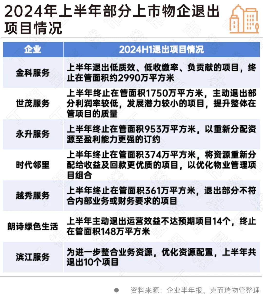 其二,物企与业主更换意愿提升。一方面,物企主动退出部分低质项目,2024年上半年,金科服务退出低质效、低收缴率、负贡献的项目,终止在管面积约2990万平方米;世茂服务同样主动退出部分利润率较低、发展潜力较小的项目,终止在管面积1750万平方米。另一方面,物业费降价舆情持续发酵,部分业主通过更换物业公司,以便达成降低物业费的目标。