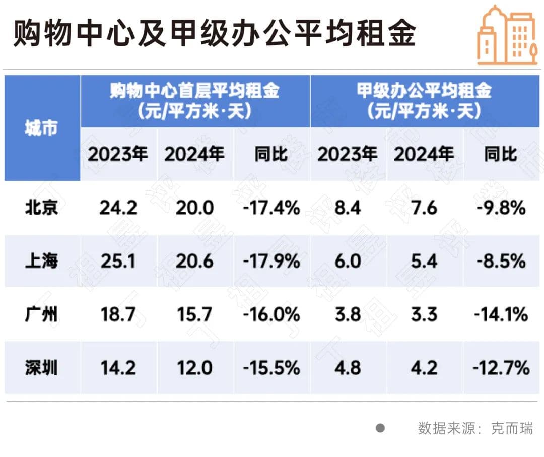 从非住市场来看,受限于实体经济萎靡不振,商办项目招租压力不断加大,租金持续下滑。以一线城市为例,2024年购物中心首层平均租金同比跌幅皆超15%,甲级办公楼平均租金同比跌幅都在10%附近。