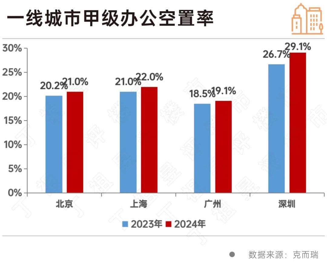 甲级办公楼空置率持续上升。以一线城市为例,2024年北京、上海和广州甲级办公空置率都在20%左右,较2023年均有不同程度的增长,深圳空置率提升2.4个百分点至29.1%。