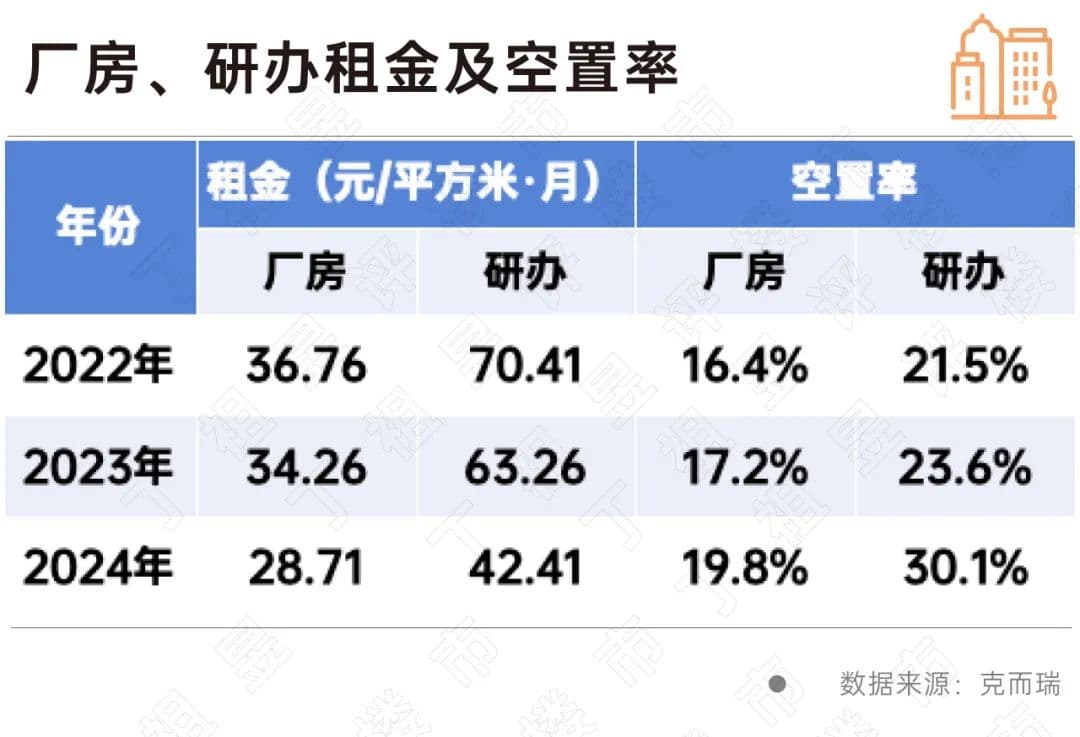 产业园不仅租金下行,而且空置率持续上升。2024年,工业厂房租金同比下降16.2%,空置率升至19.8%,同比提升2.6个百分点;研发办公楼租金同比下降33%,空置率高达30.1%,同比提升6.5个百分点。