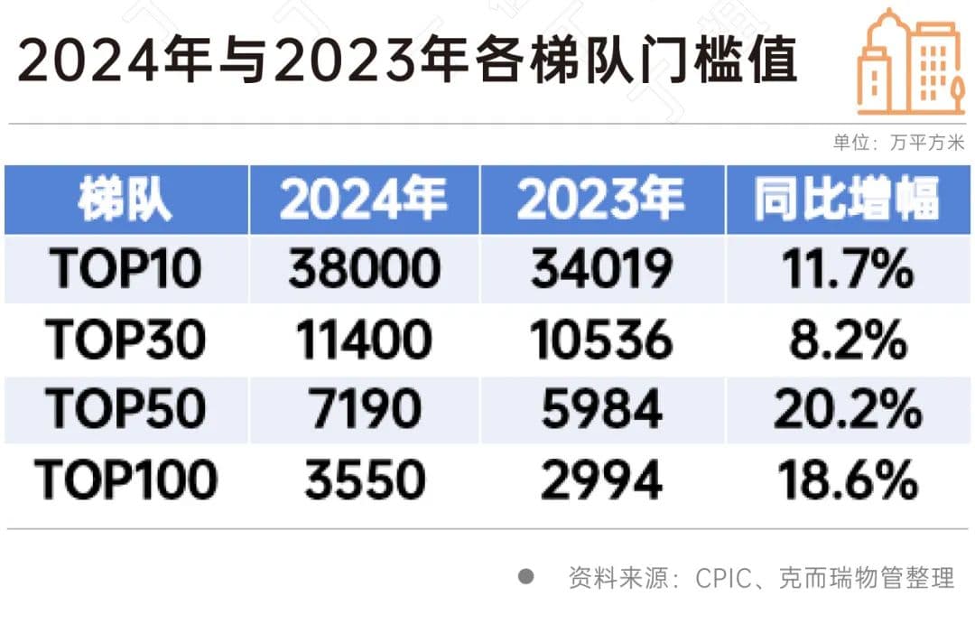 数据显示,2024年TOP10企业在管面积门槛值达3.8亿平方米,TOP30企业在管面积门槛值达1.14亿平方米,TOP50在管面积的门槛值达7190万平方米。