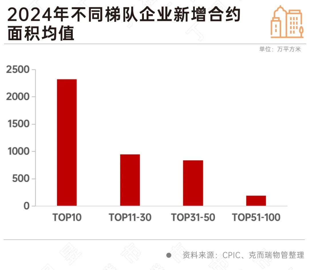 头部企业与其他梯队之间的差距进一步扩大。2024年TOP10企业新增合约面积均值为T0P11-30企业的2.4倍。