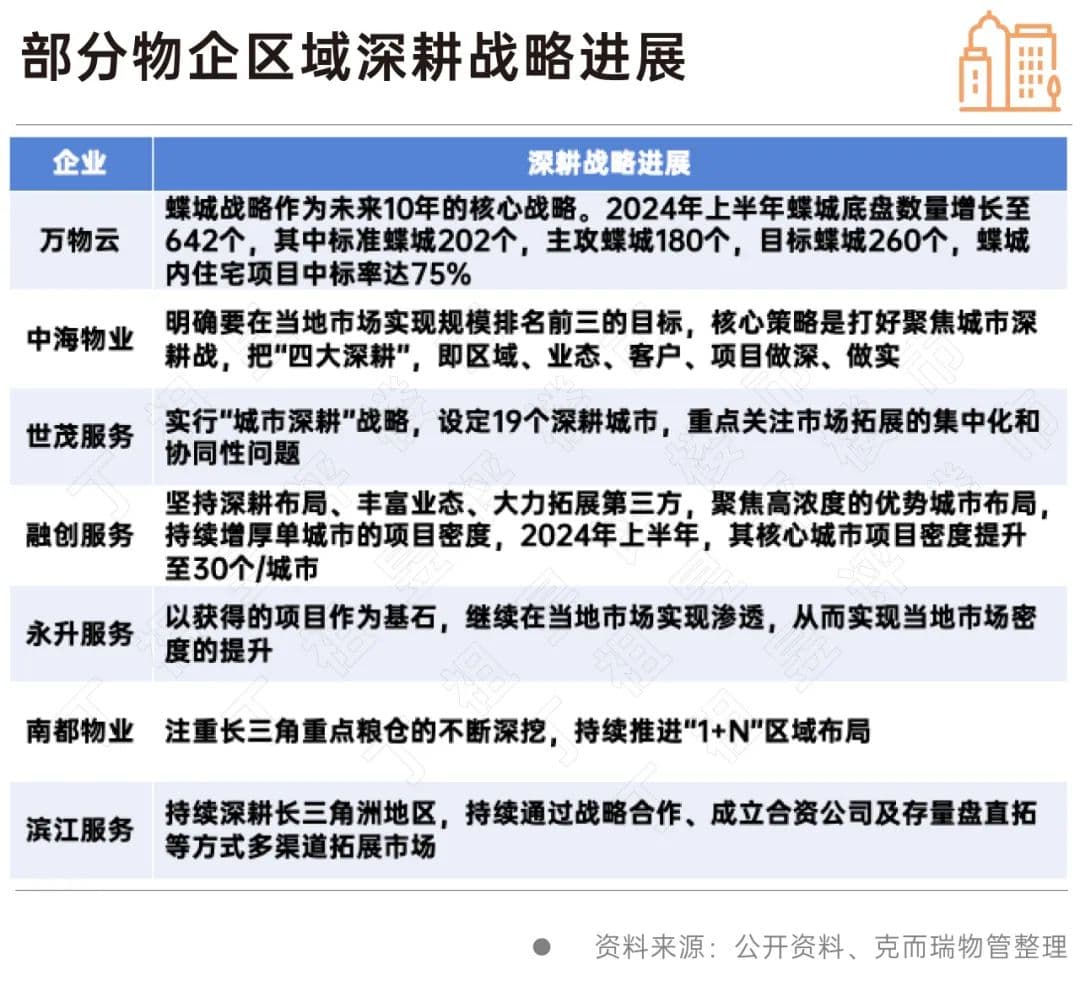 例如,万物云早在2020年就提出了将“蝶城”战略作为未来十年的核心发展方向。截至2024年上半年,万物云的蝶城数量已增长至642个。中海物业则设定了在当地市场实现规模排名前三的目标,积极拓展市场份额。世茂服务明确了19个重点深耕城市。融创服务聚焦于高浓度的优势城市布局,2024年上半年,其核心城市项目密度提升至平均每城市30个项目。