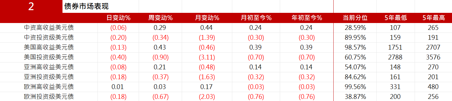 二级市场方面,中资美元债投资级市场整体较为稳健,国企板块,中石油、中海油收窄4-6bps;科技板块,百度收窄2bps,腾讯走阔2bps;金融板块,中国银行收窄7bps左右;AMC板块,中国长城收窄4bps。