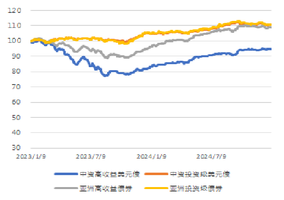 图1. 中资及亚洲美元债指数走势(基准=100)