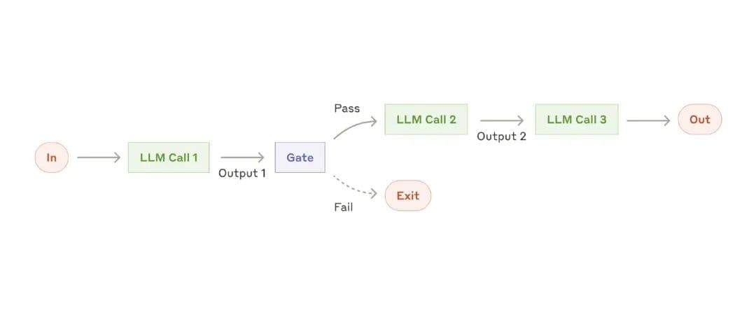 提示链将单个任务分解为一系列步骤,其中每个 LLM 调用都会处理前一个调用的输出。你可以在任何中间步骤上添加程序检查(参见下图中的“gate”),以确保流程仍在正常进行。