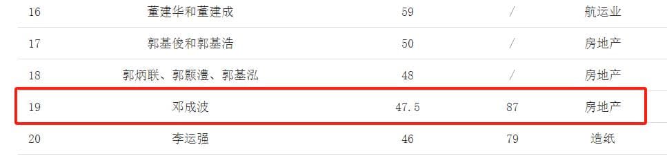 鼎盛时期,香港有一半的铺位都归邓成波所有,他也成了公认的香港“铺王”。到去世为止,2021年邓成波以47.5亿美元财富位列《福布斯中国香港富豪榜》第19位。