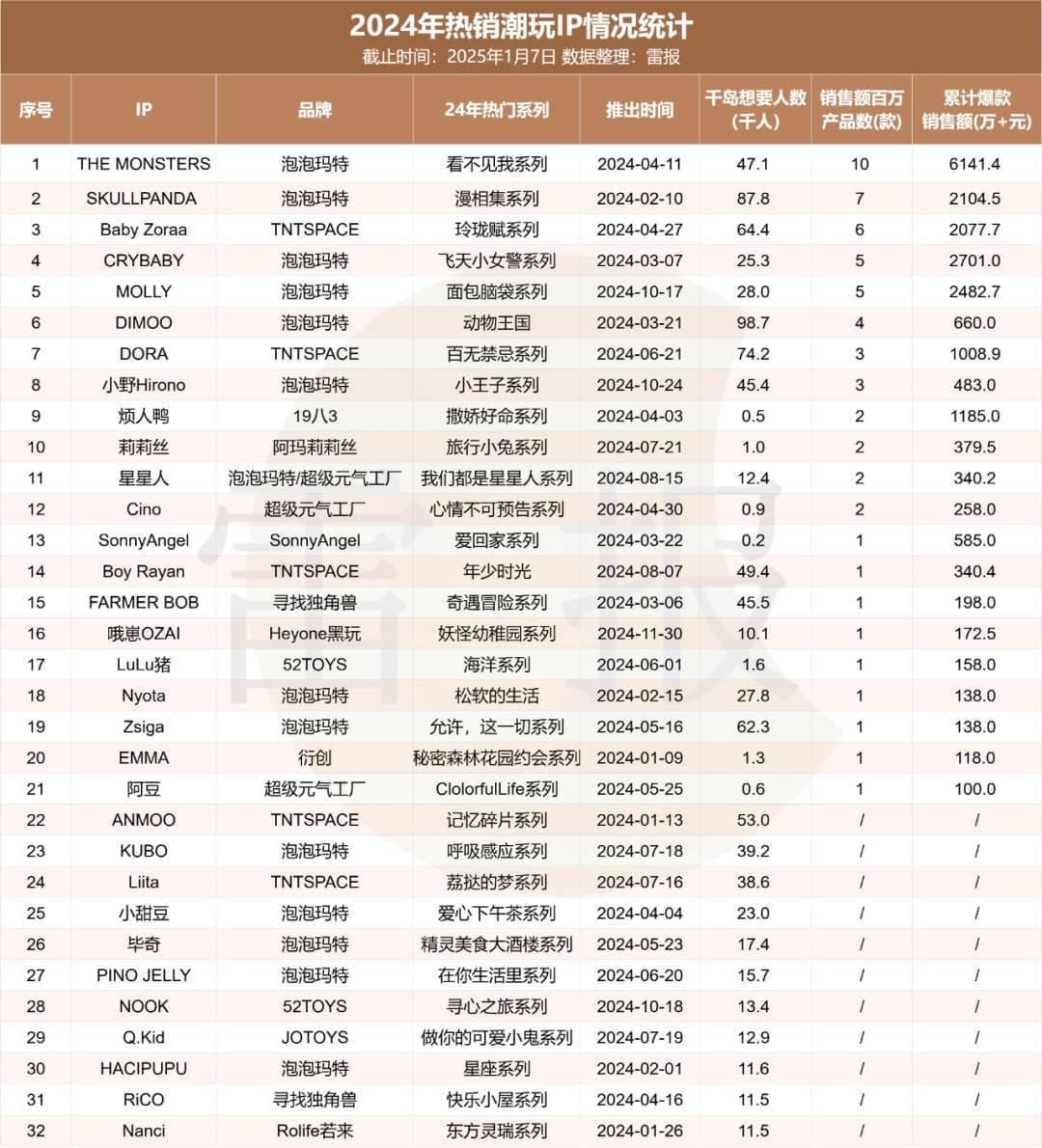 首先,本文结合上篇文章中的222个爆款、千岛平台潮玩系列的想要人数和相关网络资料,整理了业内过去一年热销的32个潮玩IP,名单如下:(注:由于部分热销产品售罄下架或其他原因无法统计,因而爆款产品数及销售额仅供参考)