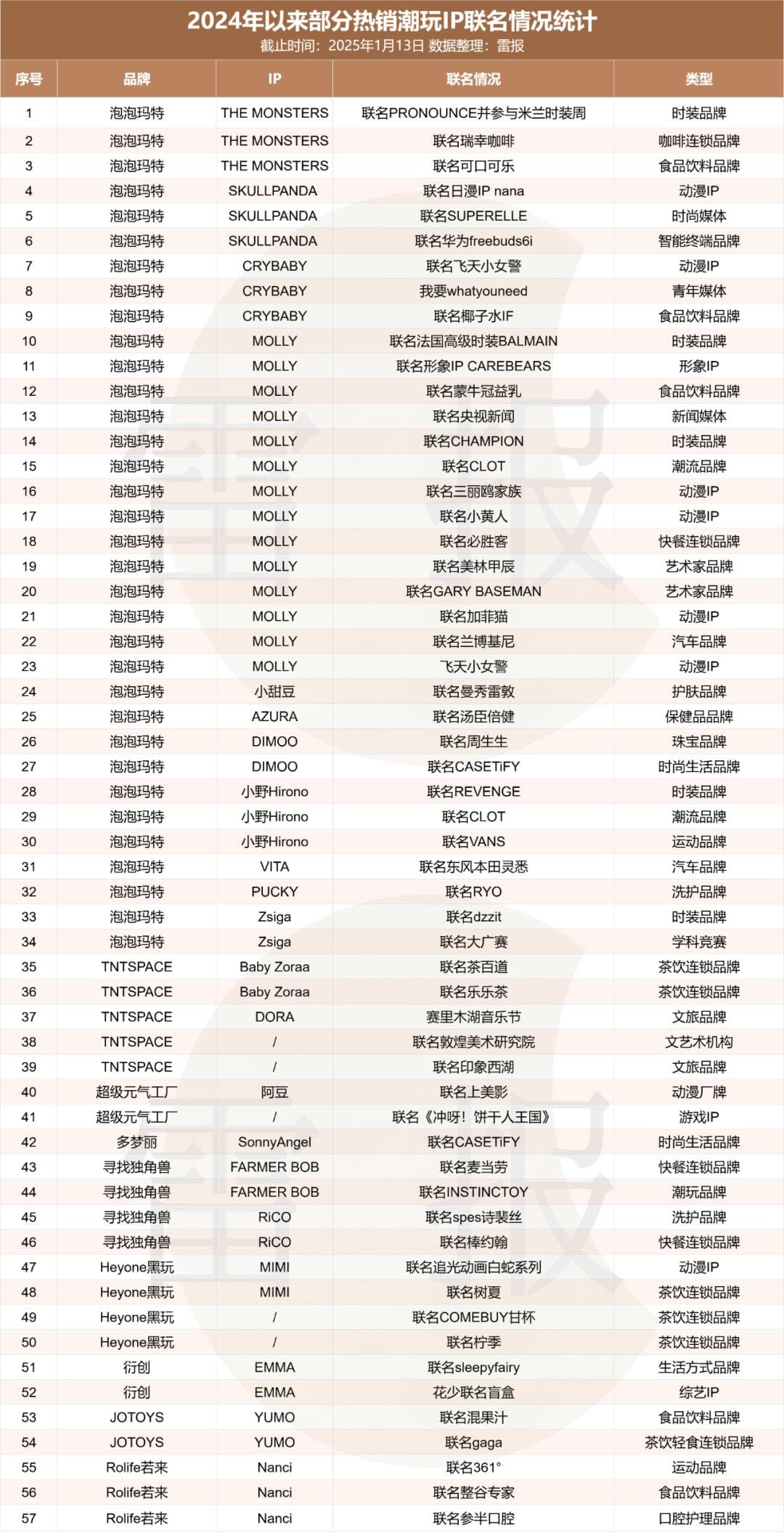 不过,在当下的潮玩赛道中,这样的IP并不算多。雷报以上述32个热销潮玩IP及其所属12个潮玩品牌为范围在互联网平台进行检索,统计发现过去一年至少有57起潮玩IP联名合作事件(人工统计存在误差),名单如下: