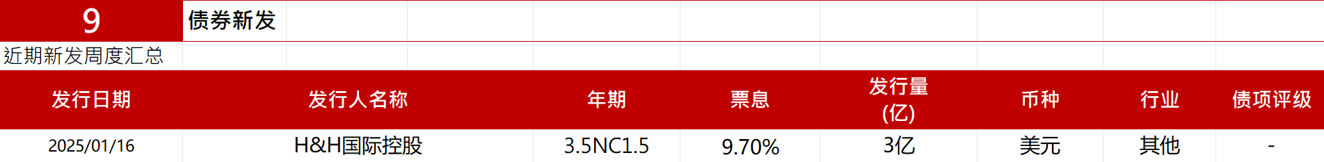 二级市场方面,中资美元债投资级市场整体较为稳健,国企板块,中化集团、中海油收窄7-8bps;科技板块,美团、小米收窄8bps左右;金融板块,中金香港收窄13bps;AMC板块,中国信达收窄6bps。