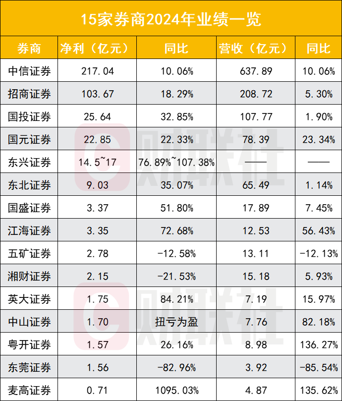 综合已披露业绩的15家券商净利润情况,中信证券以217.04亿元居首,其次是招商证券(103.67亿元)、国投证券(25.64亿元)、国元证券(22.85亿元)、东兴证券(14.5亿元至17亿元)、东北证券(9.03亿元)、国盛证券(3.37亿元)、江海证券(3.35亿元)、五矿证券(2.78亿元)、湘财证券(2.15亿元)、英大证券(1.75亿元)、中山证券(1.7亿元)、粤开证券(1.57亿元)、东莞证券(1.56亿元)、麦高证券(0.71亿元)。