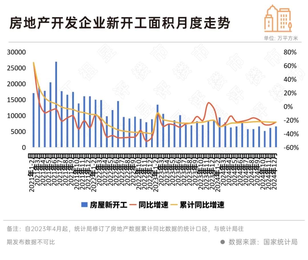 2024年全年,房屋新开工面积7.4亿平方米,同比下降23%,其中,住宅新开工面积5.4亿平方米,同比下降23.0%。
