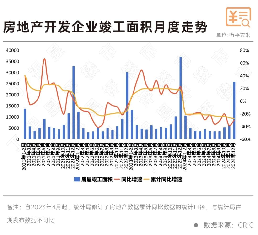 2024年以来,竣工面积持续同比回落的原因主要是2023年保交楼导致指标基数较高,实际总量已完成了年初既定任务,2024年12月末召开的全国住房城乡建设工作会议指出,2024年已交付住房338万套,完成既定目标。