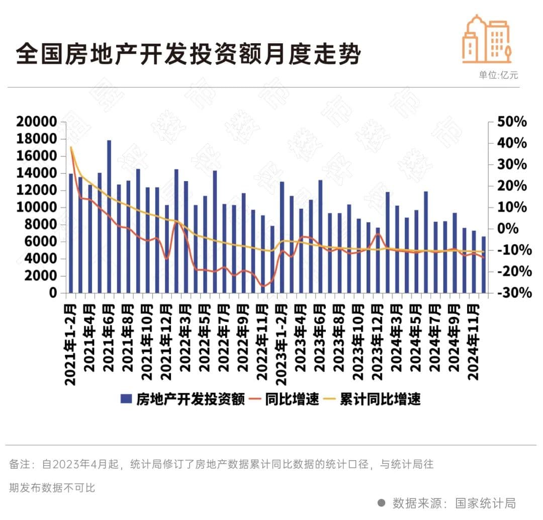 2024年,全国房地产开发投资10万亿元,同比下降10.6%,降幅较前11月扩大0.2个百分点。单月来看,房企开发投资6646亿元,环比下降9.3%。