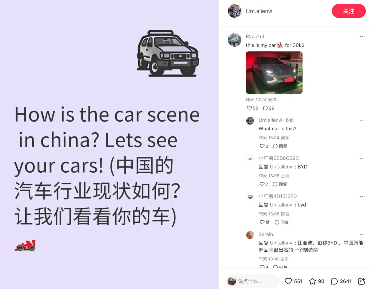 小通也逛了一下小红书,发现一些外国人真的对中国汽车行业十分好奇。不少国外网友表示,“想了解中国汽车行业的现状”,“美国不允许进口中国车,听过你们的车很酷“之类的。