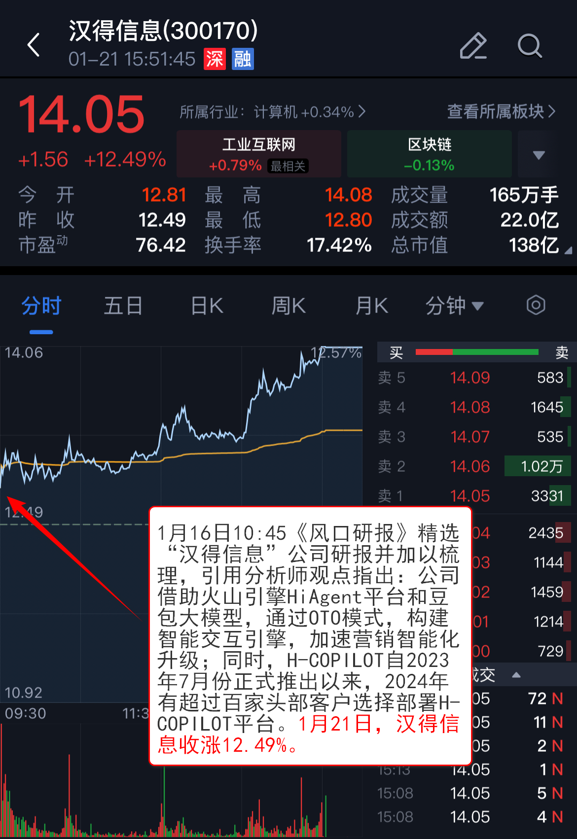 ,引用分析师观点指出:公司借助火山引擎HiAgent平台和豆包大模型,通过OTO模式,构建智能交互引擎,加速营销智能化升级;同时,公司构建了自主的融合AIGC平台H-COPILOT,自2023年7月份正式推出以来,2024年有超过百家头部客户选择部署H-COPILOT平台,后续公司AI业务有望持续稳定增长。1月21日,汉得信息收涨12.49%。