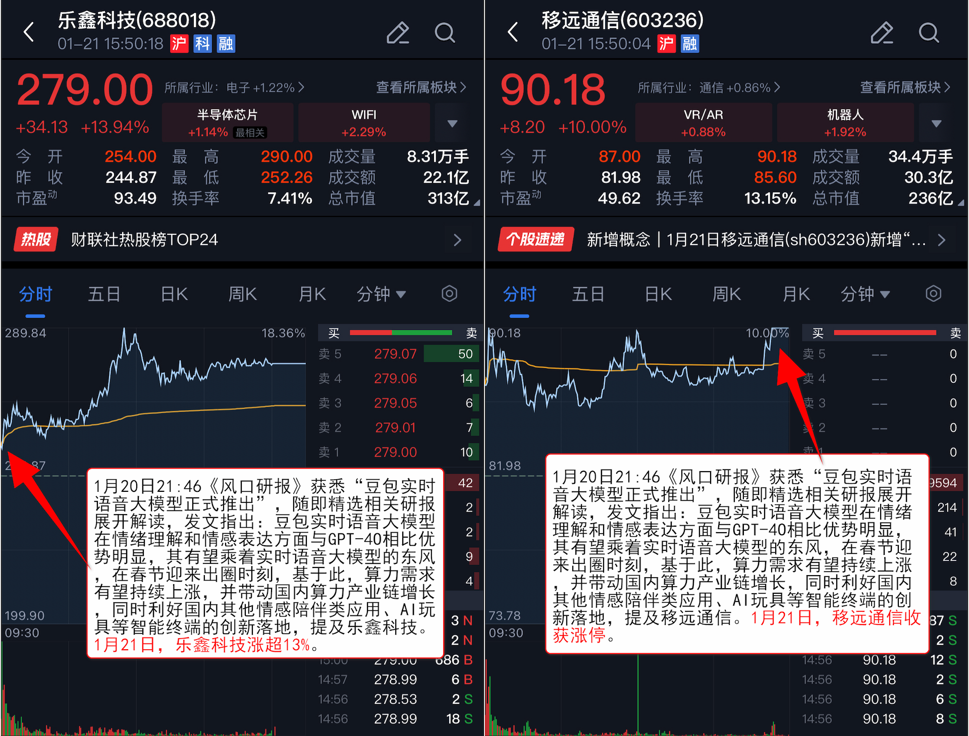 ,随即精选相关研报展开解读,发文指出:豆包实时语音大模型在情绪理解和情感表达方面与GPT-4O相比优势明显,其有望乘着实时语音大模型的东风,在春节迎来出圈时刻,基于此,算力需求有望持续上涨,并带动国内算力产业链增长,同时利好国内其他情感陪伴类应用、AI玩具等智能终端的创新落地,提及移远通信、乐鑫科技。1月21日,移远通信收获涨停,乐鑫科技涨超13%。