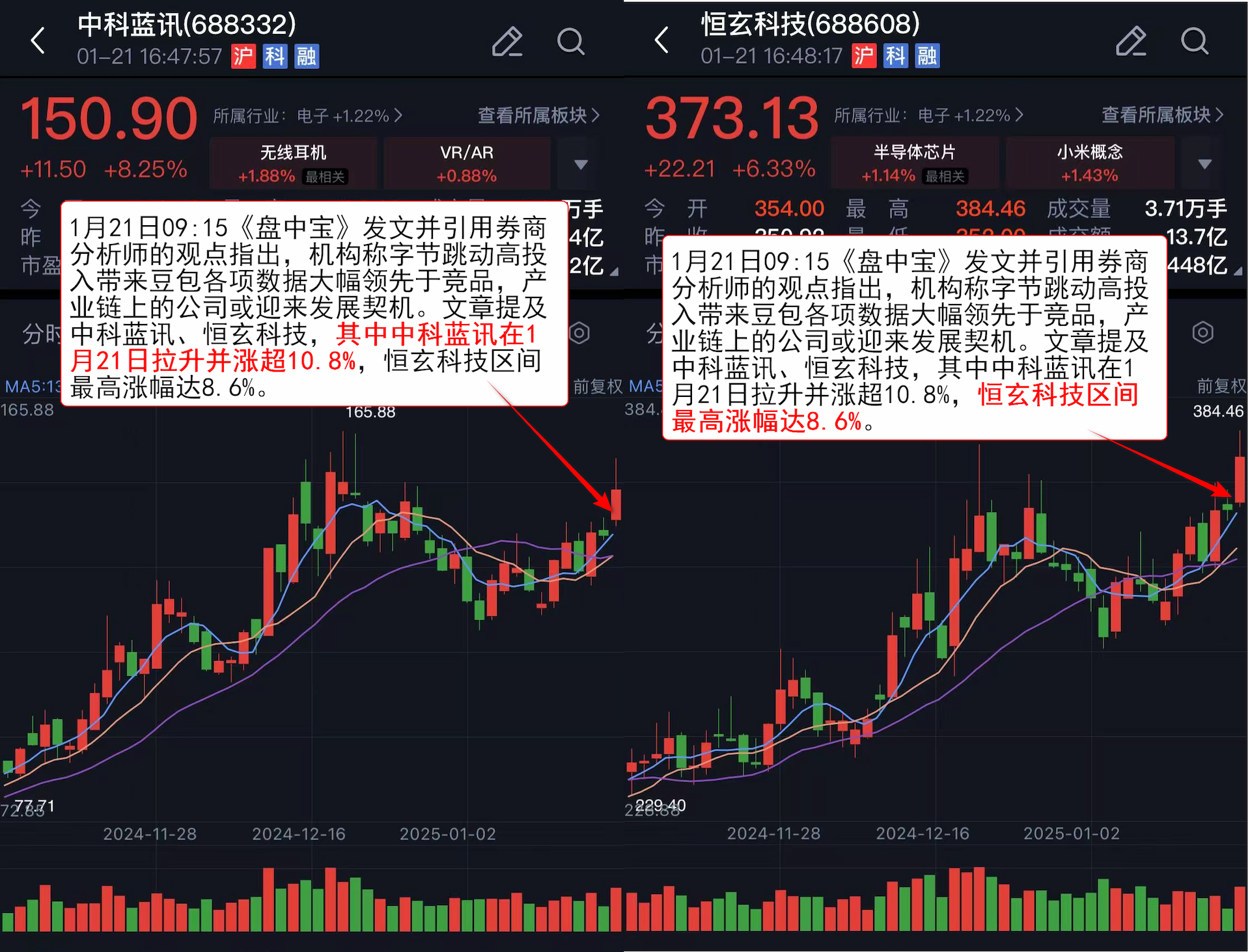 ,机构称字节跳动高投入带来豆包各项数据大幅领先于竞品,产业链上的公司或迎来发展契机。文章提及中科蓝讯、恒玄科技,其中中科蓝讯在1月21日拉升并涨超10.8%,恒玄科技区间最高涨幅达8.6%。