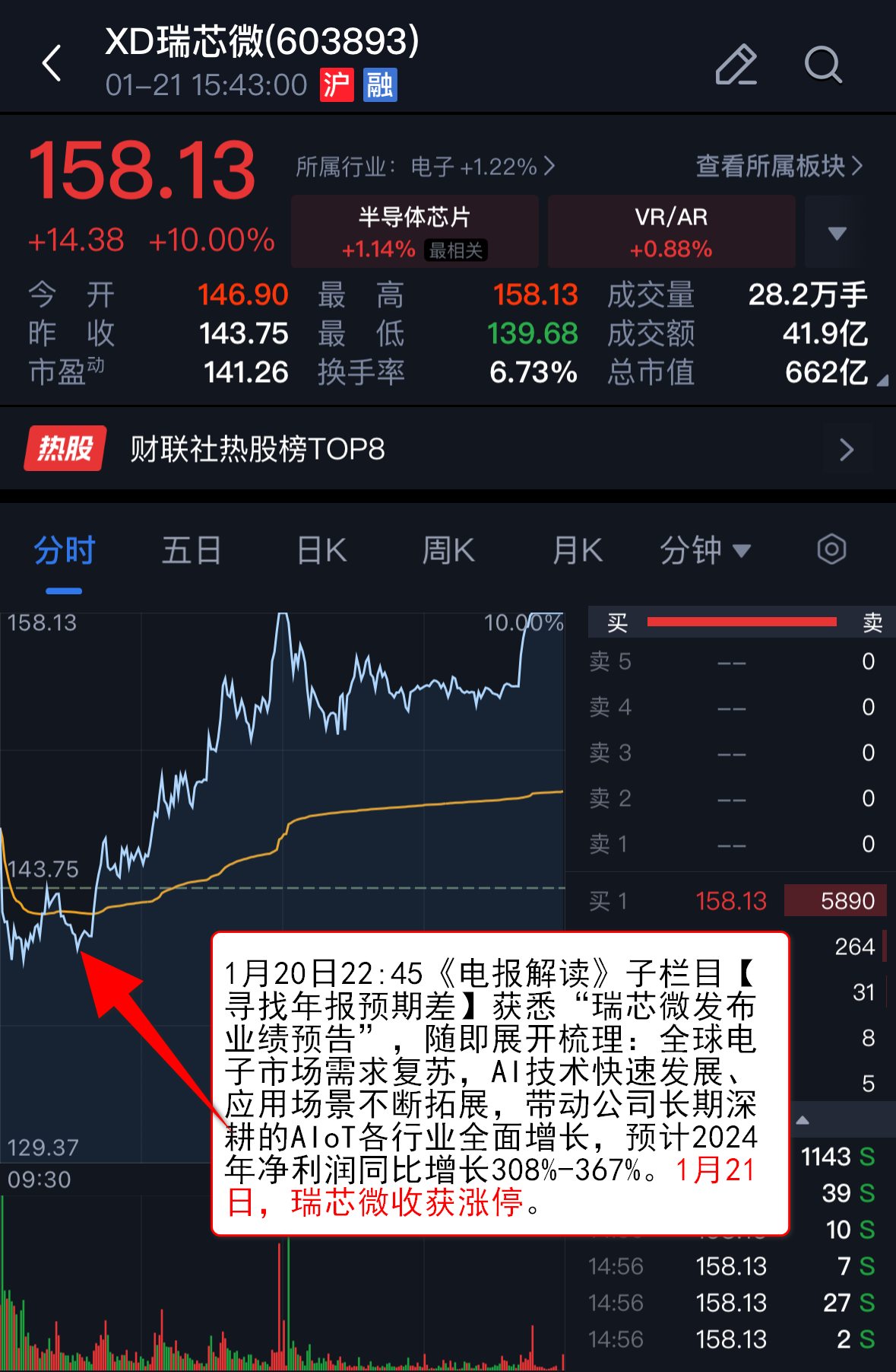 ,随即展开梳理:全球电子市场需求复苏,AI技术快速发展、应用场景不断拓展,带动公司长期深耕的AIoT各行业全面增长,预计2024年净利润同比增长308%-367%。1月21日,瑞芯微收获涨停。