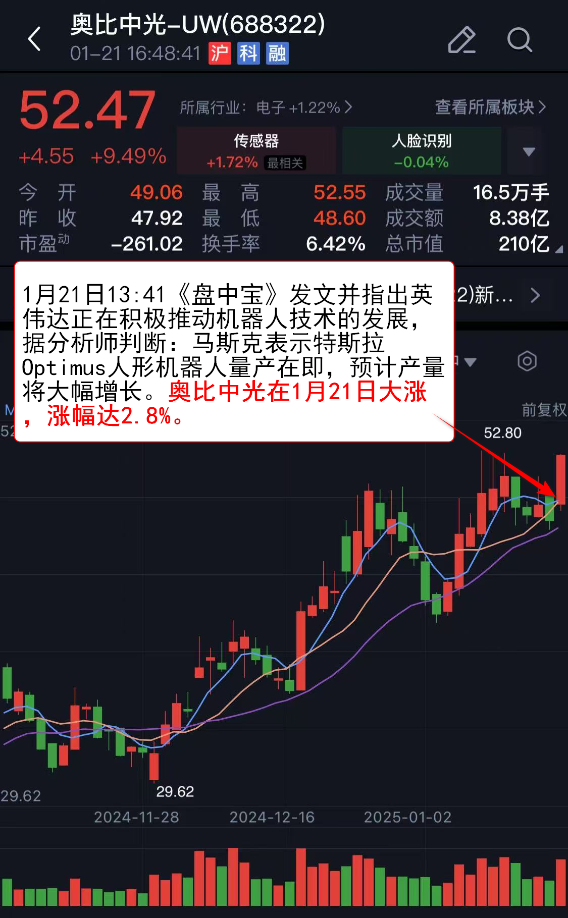 ,据分析师判断:马斯克表示特斯拉Optimus人形机器人量产在即,预计产量将大幅增长。奥比中光在1月21日大涨,涨幅达2.8%。