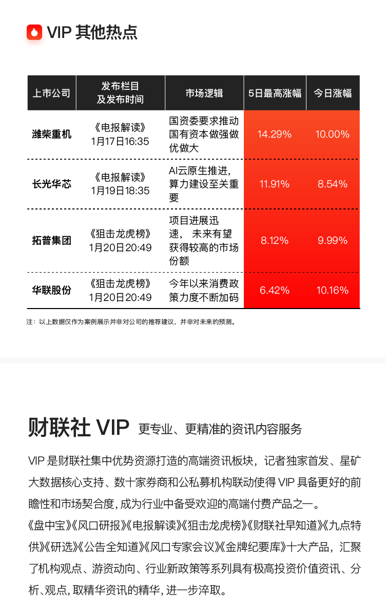 注:财联社VIP为内容资讯产品,并非投资建议。以下内容仅为资讯价值展示非对相关公司的推荐建议,非未来走势预测。投资有风险,入市需谨慎。
