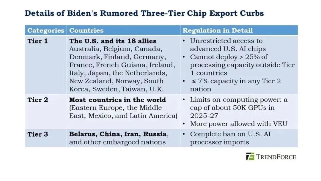 关于拜登政府最近的系列禁令,我们已经在《卸任前夕,拜登又砍了中国汽车两刀》一文中分析过,总结来说,这一最严芯片政令,覆盖面很广,但聚焦的打击重点直指中国,不仅波及中国的人工智能产链,也影响了智能驾驶使用的高端芯片。
