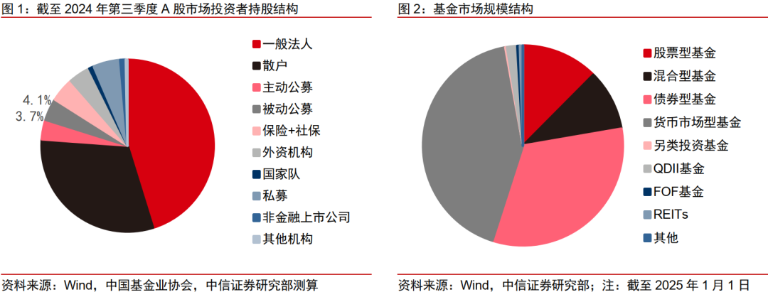 1)我们测算得到2025年公募渠道整体新增入市资金对应约5800亿元左右,被动基金发展或成为重要支撑。截至2024Q4,我们测算全市场公募基金持有A股市值约5.87万亿元,其中主动股票型(普通股票+偏股混合+灵活配置)约2.51万亿元,被动股票型(被动指数+指数增强)约3.20万亿元,“固收+”类型(偏债混合、平衡混合等)约1616亿元。若按照监管“公募基金持有A股流通市值未来三年每年至少增长10%”的要求,则2025年公募渠道整体新增资金对应约5800亿元左右。证监会主席吴清在发布会上提出“加快推进指数化投资发展,制定促进指数化投资高质量发展行动方案”,我们测算股票型ETF资产净值从2024年年初的1.5万亿元增长到2025年年初的约2.9万亿元,占权益基金的比重从2024年年初的约25%提升到2025年年初的约42%,预计此后被动管理产品开发进程或将加快。