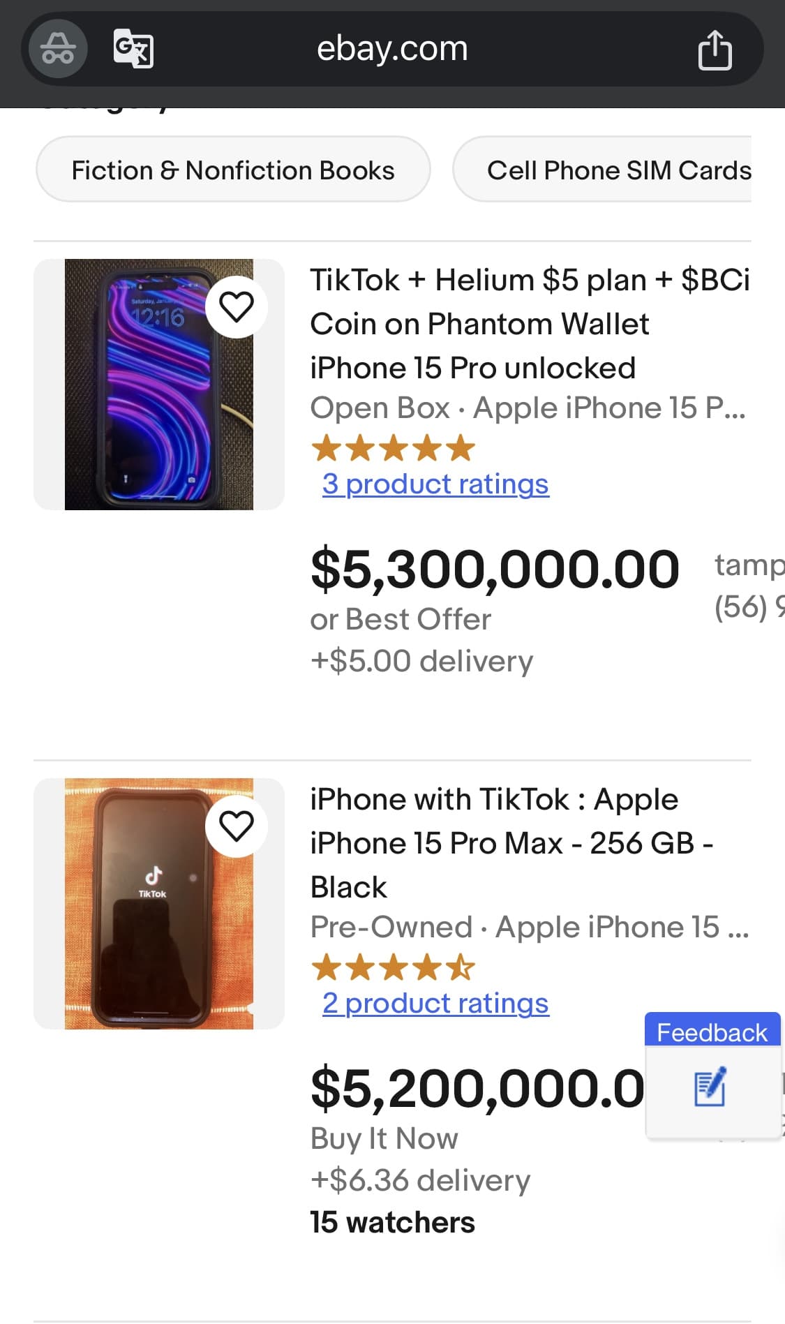这也催生出一类新的交易。一些人正在销售已安装了TikTok应用程序的手机和平板电脑,溢价卖给需要这一应用程序的用户。上周五,美国交易平台eBay一台预装TikTok和拥有比特币数字钱包等的设备,最高售价标到5300000美元,令人大跌眼镜。