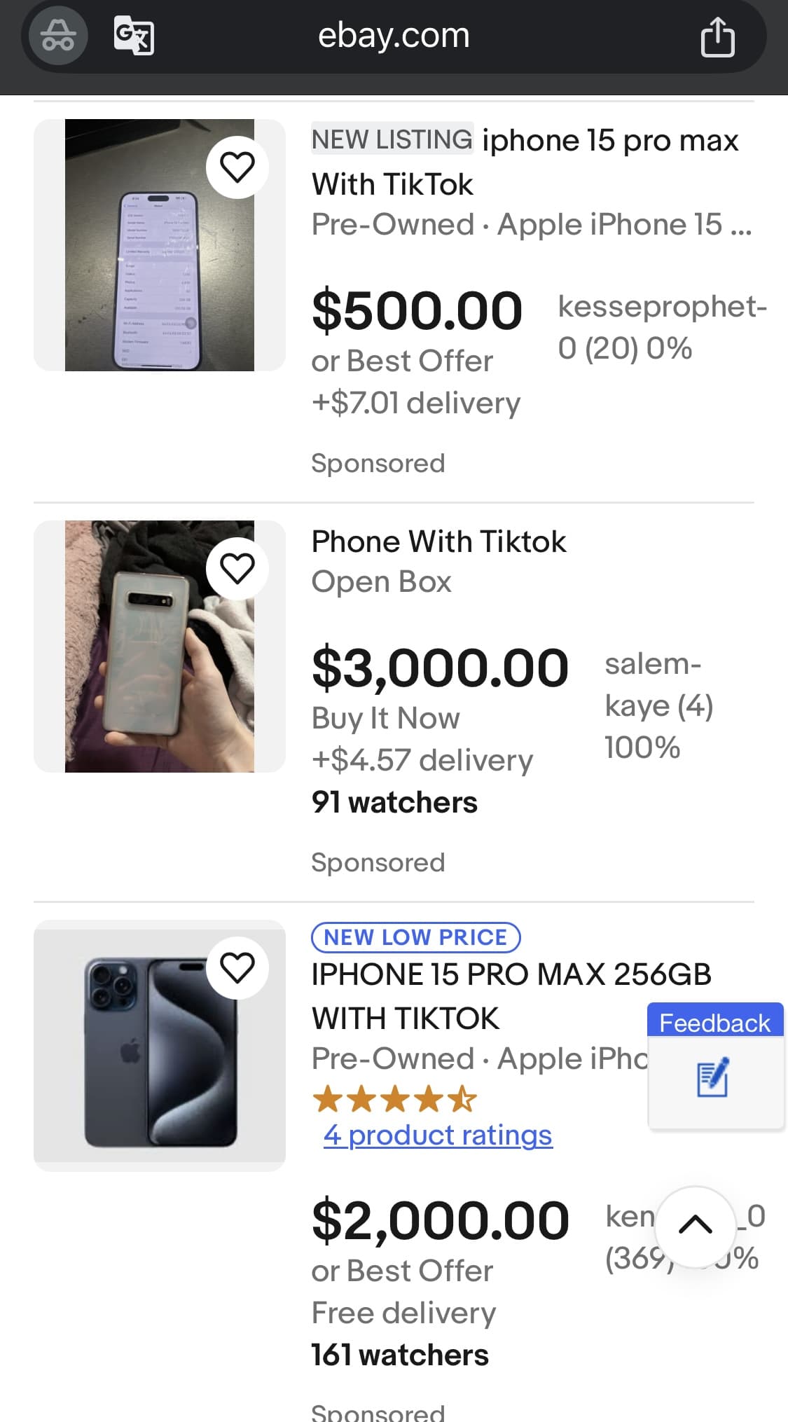 他以10000美元的价格挂单了一部装有TikTok的iPhone 14 Plus,目前买家对该设备的最高出价为4550美元。而不带TikTok的全新iPhone 14 Plus在官网售价仅为699美元。