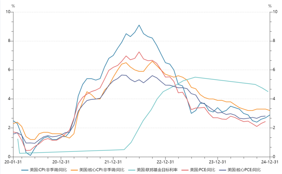 从消费物价指数(CPI)看,美国12月CPI同比增长2.9%,连续第三个月反弹至2024年7月以来新高;与此同时,剔除食品和能源的核心CPI同比上涨3.2%,低于预期和前值3.3%,环比上涨0.2%。核心CPI同比增速2024年9月以来一直保持在3.3%,环比增速连续4个月保持在0.3%,两者都在2024年12月首次略有下降,激发了市场的乐观情绪。