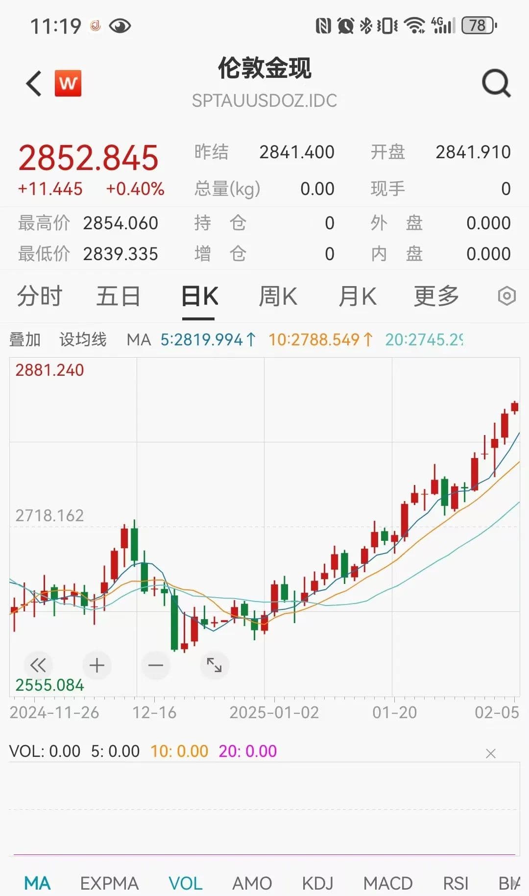2月5日上午,现货黄金再创新纪录,摸高至2854美元/盎司。而2月4日,美国黄金期货(COMEX黄金)主连价格最高报每盎司2874美元,也创下历史新高。