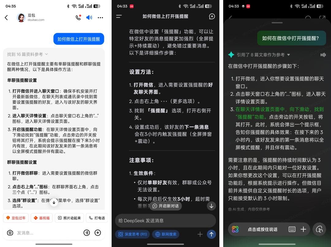 在一些软件级别的问题,例如「如何微信上打开强提醒」「怎么取消自动付款」等需求,目前包括豆包、DeepSeek 以及手机自带的 AI 助手服务都能返回正确且详细的设置步骤,已经完全能代替我教会长辈,大大减轻我的压力。