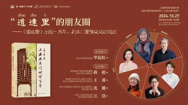 嘉宾:华霞虹(同济大学建筑系教授)、蒋毅(英国查普门泰勒中国区董事、东斯文里主创建筑师)、王溪(慎成里LANERS初心会客厅主理人、同济大学建筑与城市规划学院博士后)沈璐(清华大学建筑设计研究院上海分院副院长、《道达里》作者)、江岱(上海文化出版社副总编、《道达里》责任编辑)