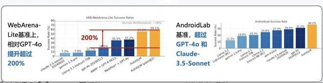 在 Phone Use 和 Web Browser Use 上,AutoGLM 都取得了大幅的性能提升。在 AndroidLab 评测基准上,AutoGLM 就显著超越了 GPT-4o 和 Claude-3.5-Sonnet 的表现。在 WebArena-Lite 评测基准中,AutoGLM 更是相对 GPT-4o 取得了约 200% 的性能提升,大大缩小了人类和大模型智能体在 GUI 操控上的成功率差距。