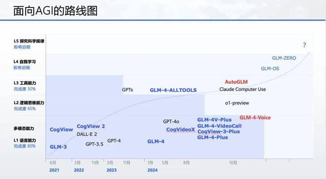 可以说,截止目前, 前三阶段的竞争大家都走得差不多,差别就在于更高阶段的 Level 4 和 Level 5,OpenAI 探索的是 AI 自己能够发明创新并最终融入组织或自成组织。在这两个决定未来 AI 能力走向的关键阶段,如今的智谱有了更全面的定义和解读。
