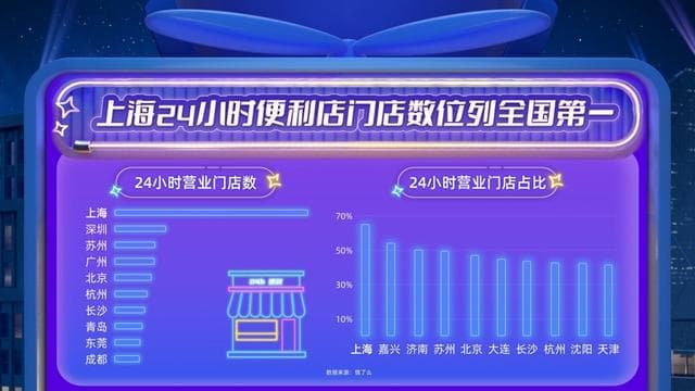 饿了么数据显示,上海无论是便利店总数、24小时营业的门店数还是24小时营业的门店占比均位列全国首位,每3家便利店中,就有2家提供24小时服务。