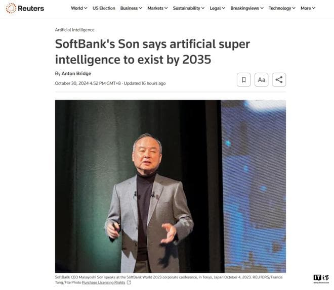 IT之家 10 月 31 日消息,据路透社报道,软银集团 CEO 孙正义于本周二(29 日)重申,他坚信人工超级智能( ASI )即将到来,并认为实现这一愿景将需要数千亿美元的投入。