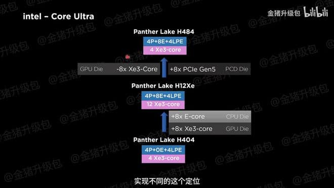 英特尔在 Panther Lake 系列上总共规划了 3 款芯片,分别是最低的“404”、主打大核显的“12Xe”、额外提供 8 条 PCIe 5.0 通道的“484”。