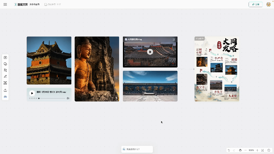 前段时间国产单机游戏《黑神话:悟空》大火,带动了山西旅游。我们在网盘中搜索关键词“大同”,检索出所有用户分享给我的关于大同的文件,将这些包括音频、视频、图片类的文件统一拖到自由画布中。