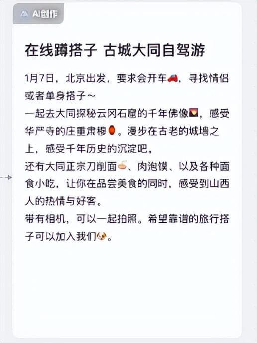 自由画布还可以生成符合当下流行的内容分享形式的内容,比如生成找搭子文案。