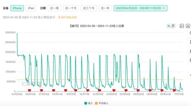 图注:《原神》在iPhone端预估营收的趋势图。数据来源:七麦数据