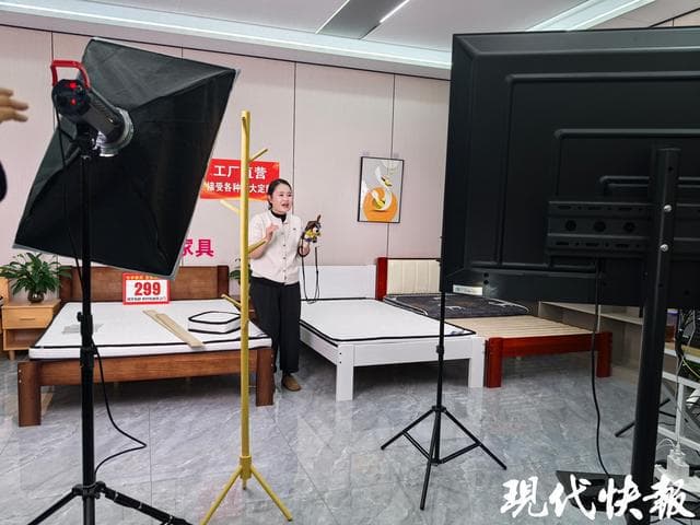 11月29日下午,正是周五,但宿迁市宿城区耿车镇大众村夏和虎电商工作室内一派忙活。一名女主播正对着手机介绍一款实木家具床。屏幕上,网友留言咨询不断,女主播热情互动,熟练地介绍着实木床的各种优点,后台的成交量一路上涨。