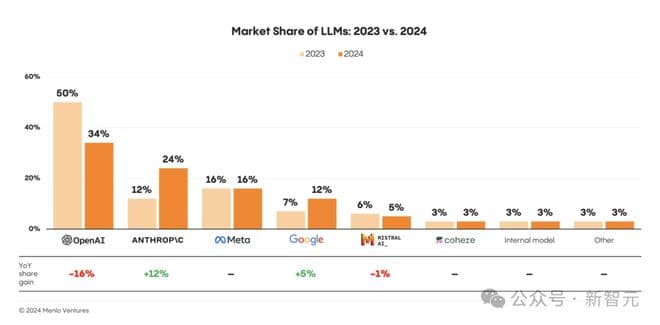 在闭源模型中, OpenAI的先发优势有所削弱,企业市场份额从50%下降至34%,一些企业在选择模型时从GPT-4转向Claude 3.5 Sonnet,主要受益者Anthropic的企业占有率从12%翻了一番至24%