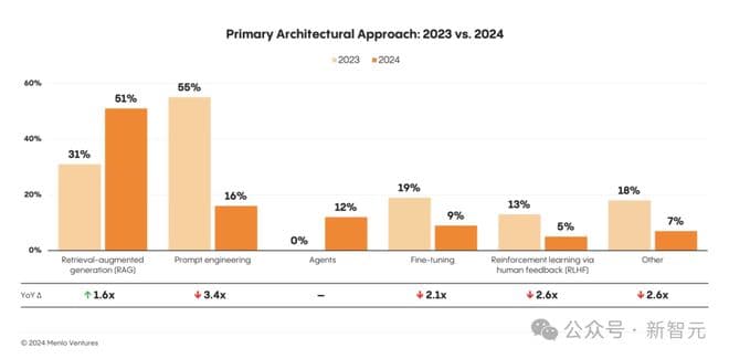 RAG(检索增强生成)目前以51%的采用率占据主导地位,比去年的31%大幅上升;而之前常用的微调,尤其是在领先的应用程序提供商中,已经非常少见了,大约只有9%的生产模型进行了微调。